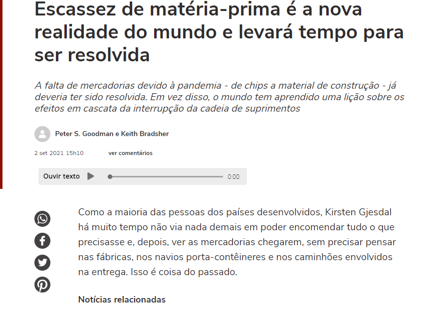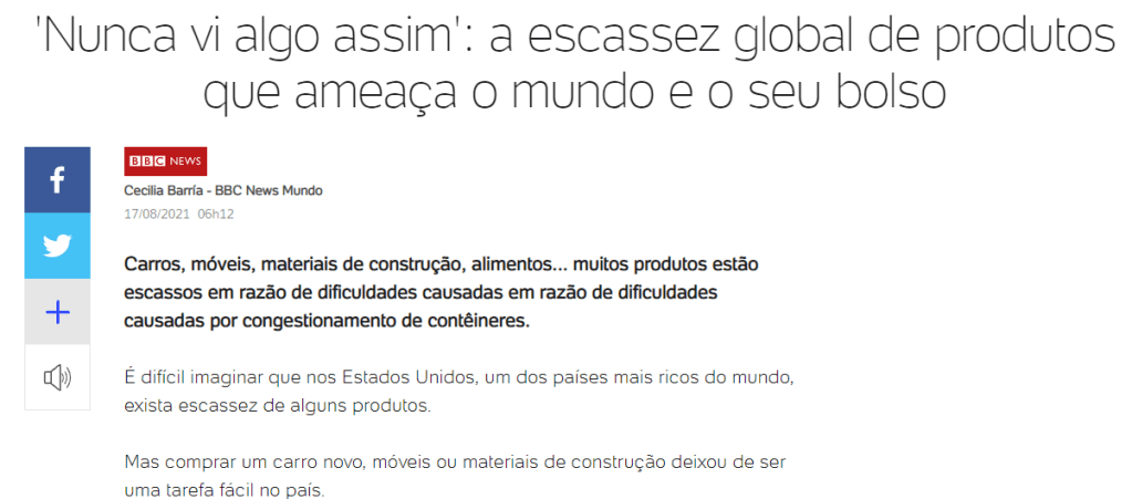 Mesmo a mídia de massa tem noticiado com alarde a escassez de diversas mercadorias devido à disrupção das cadeias de suprimento globais de várias mercadorias, por várias razões, desde a falta de containers, a congestão dos portos pelas interrupções causadas pela COVID19, as paralizações das fábricas, a falta de microchips, à crise energética em diferentes continentes por diferentes razões, e mesmo a falta de trabalhadores dispostos à voltar aos seus empregos com salários de miséria.