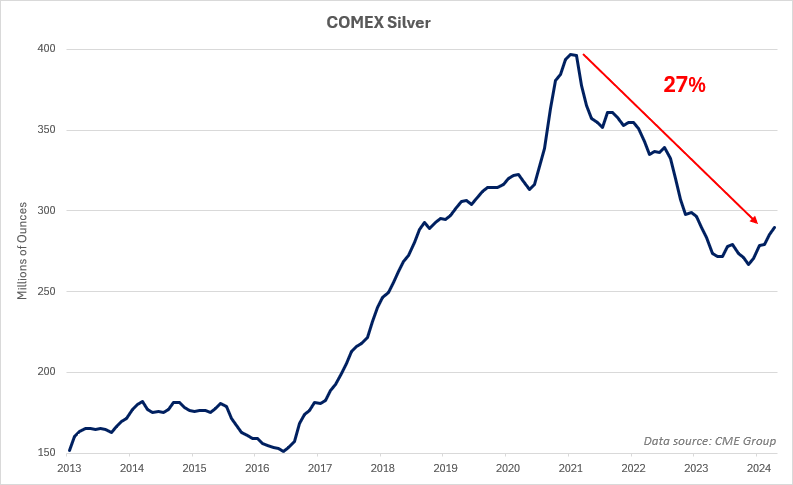 O estoque total de prata da COMEX (uma medida dos estoques de prata dos EUA) caiu 27% desde 2021: