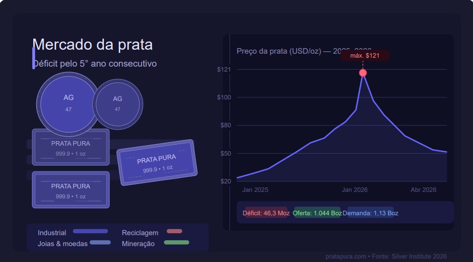 Após um aumento de 42% no preço médio anual em 2025, o início de 2026 viu a alta se acelerar, acompanhada por maior volatilidade. Os preços dispararam para uma máxima histórica acima de US$ 121 em 29 de janeiro, antes de recuarem acentuadamente, com o metal sendo negociado na faixa dos US$ 75 no início de abril. (fonte)