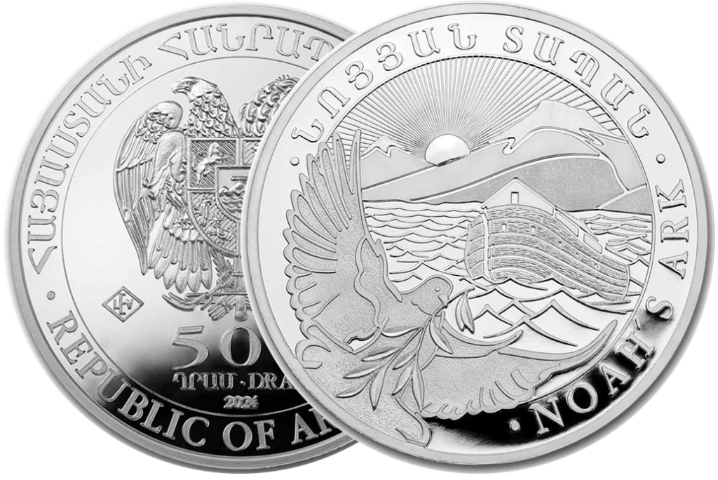 A Geiger Edelmetalle ainda produz as moedas de prata de1 oz (31,1 g) Armênia Silver Noah’s Ark. O programa de moedas de prata mais novo da Europa emana da minúscula nação da Armênia. A moeda da Armênia Silver Noah’s Ark é uma moeda de lançamento anual com um valor de face em Drams. No reverso da moeda de prata Armênia Silver Noah’s Ark, você encontrará as imagens comumente descritas na narrativa de inundações do Gênesis da Bíblia cristã. A Arca de Noé teria flutuado nas águas da inundação por 40 dias, acabando por descer no Monte Ararat depois que uma pomba voltou para o navio com um ramo de oliveira em seu bico. O anverso de todas as moedas inclui o brasão da Armênia. No centro do escudo está uma representação do conto bíblico, com uma pequena arca claramente visível sobre o Ararat e as águas abaixo. À esquerda do escudo está uma águia, enquanto o lado direito apresenta um leão. Pedidos múltiplos de 20 unidades são enviados no tubo original da Bavarian Mint.
