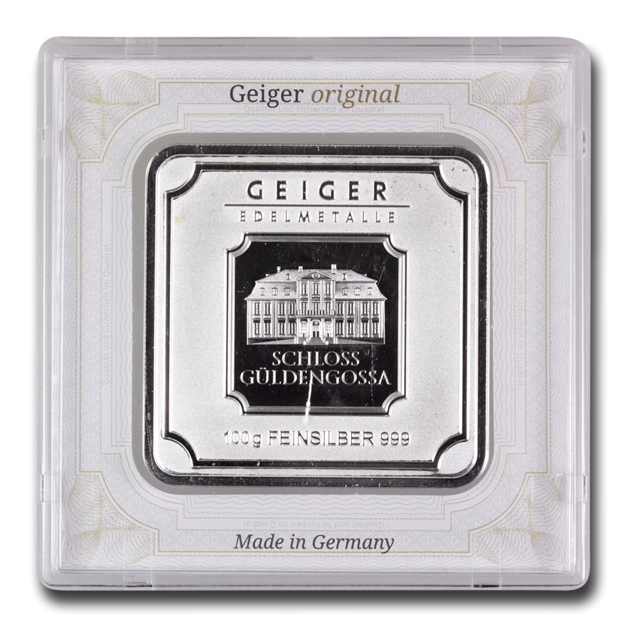 Cada barra de 100 g Geiger é composta de prata pura .999 certificada. Os clientes irão notar o extraordinário detalhe do Schloss Guldengossa, um castelo barroco localizado perto de Leipzig, na Alemanha. O castelo é apresentado com considerável arte evidenciada pelo detalhe minucioso das janelas e alvenaria da estrutura. Em termos de arte e de alta qualidade, esta barra de prata é ideal para se ter como investimento.